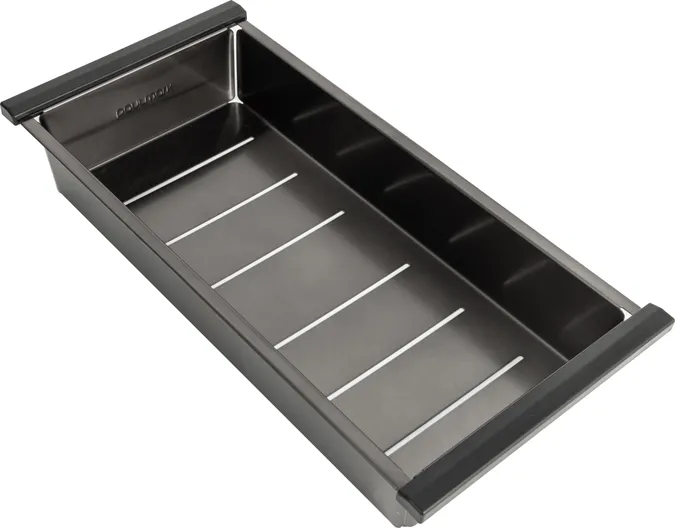 Коландеры Paulmark изготовлены из нержавеющей стали ASIS 304, устойчивы к перепадам температур и к нагрузке. Используются для мытья и размораживания продуктов. Устанавливаются на бортики мойки и в специальные ступеньки моек серии PRO. Размер отверстий в донной части не позволит выпасть даже мелким ягодам и в то же время не препятствует свободному стоку воды. Глубина коландера - 6 см.