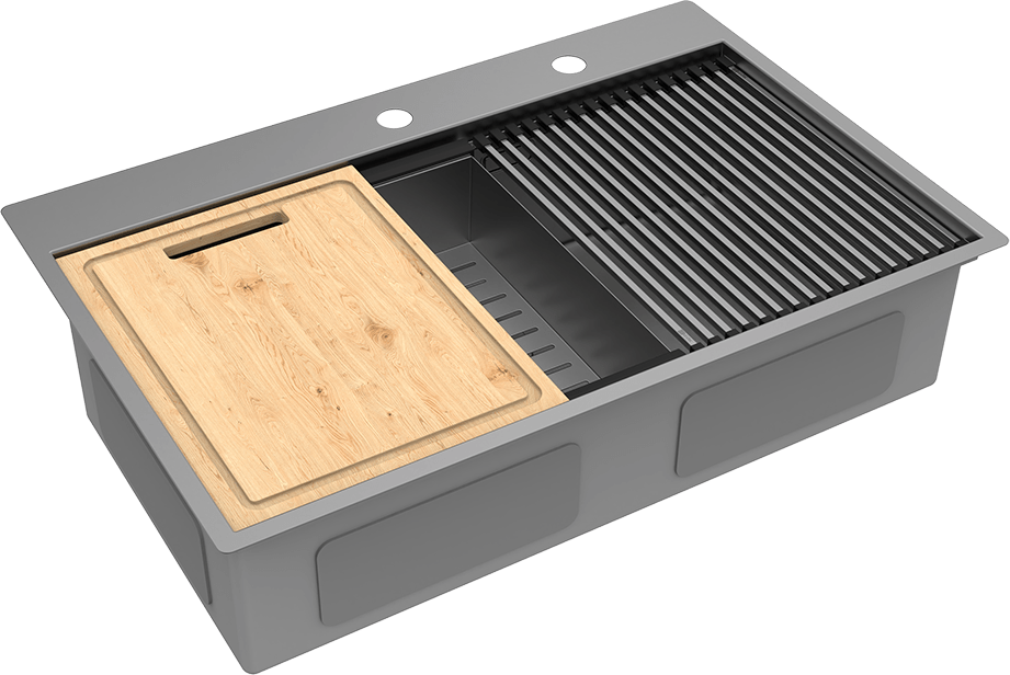 IORDANA 780 -Кухонная мойка из нержавеющей стали с одной прямоугольной и очень вместительной чашей представляет собой инновационное решение для современных кухонь, где пространство и функциональность являются ключевыми факторами. Мойка в комплекте с аксессуарами включает ролл-мат, коландер и разделочную доску, а ее ступенчатая форма позволяет устанавливать эти предметы прямо внутри чаши. Это не только экономит место на столешнице, но и делает использование аксессуаров более удобным и организованным. Например, ролл-мат можно использовать для сушки бокалов или хранения влажной губки, коландер — для разморозки продуктов, а разделочная доска — для нарезки продуктов, и все это — прямо над мойкой. Такая система организации пространства – это не просто инструмент для мытья посуды, а полноценный мир удобства и эстетики в вашем доме.