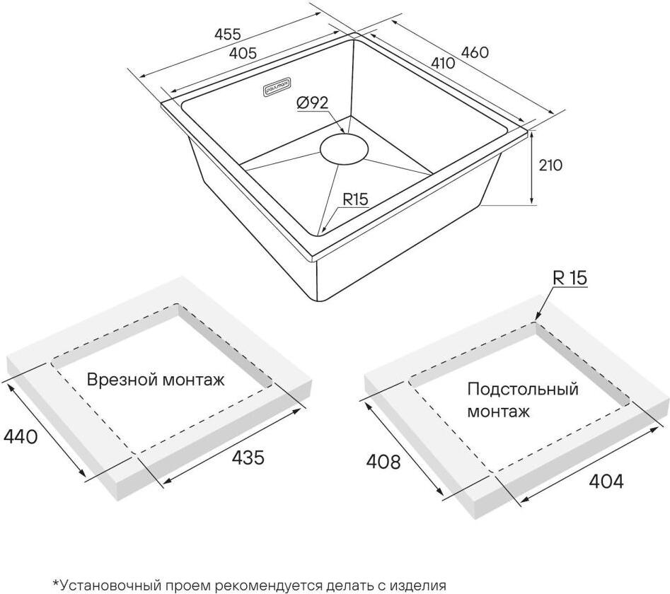 Универсальный монтаж Мойка создана как для современного способа монтажа под столешницу, так и для классического врезного монтажа.