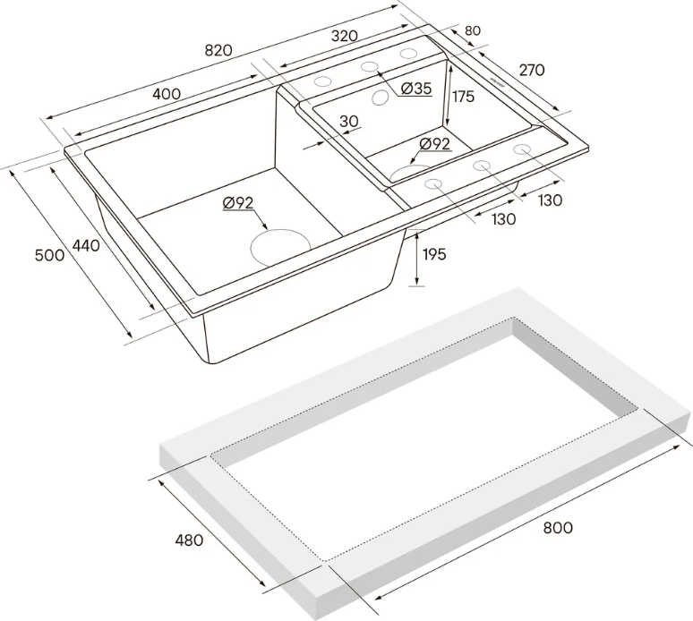 - Отверстия под смеситель: