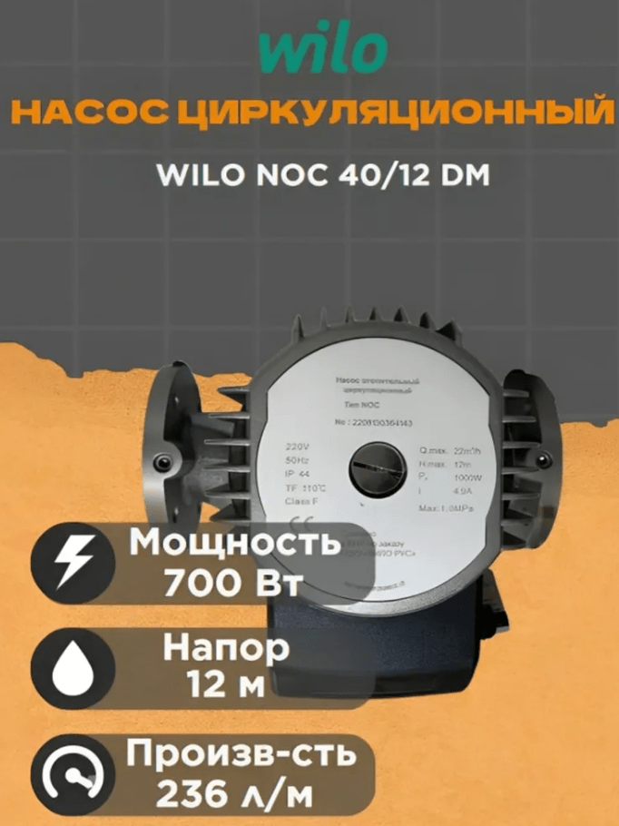Циркуляционный насос Wilo NOC 40/12 DM устанавливается для циркуляции воды и водогликолевой смеси в системах отопления. Оптимальный режим работы позволяет выбрать три ступени частоты вращения, который предварительно задается пользователем. Монтаж насоса очень прост и производится в вертикальном положении. Мотор прибора работает бесшумно и без вибрации.