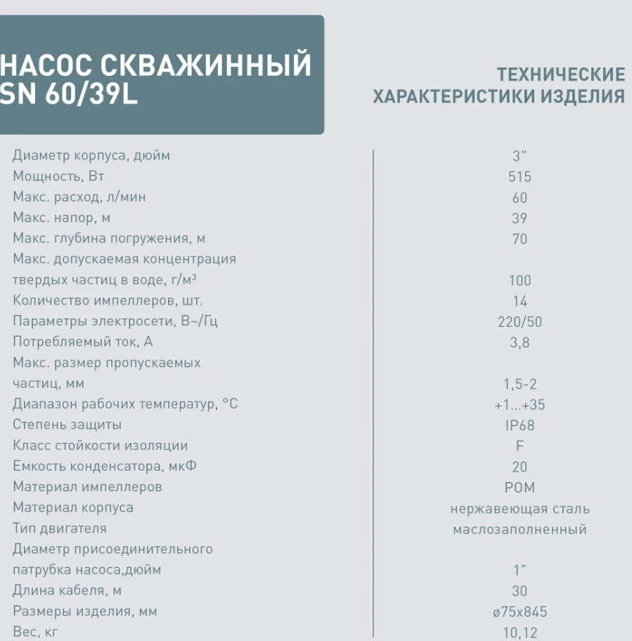 Глубинный центробежный насос прост в монтаже и обслуживании, имеет низкий уровень шума, высокую производительность и не повреждает скважину в процессе работы. Погружной насос для скважины имеет корпус из нержавеющей стали, что значительно повышает срок их службы. Все части насоса погружного для колодца, которые контактируют с водой, сделаны из материалов, безопасных для пищевых продуктов. Поэтому глубинный насос можно использовать для подачи питьевой воды.
