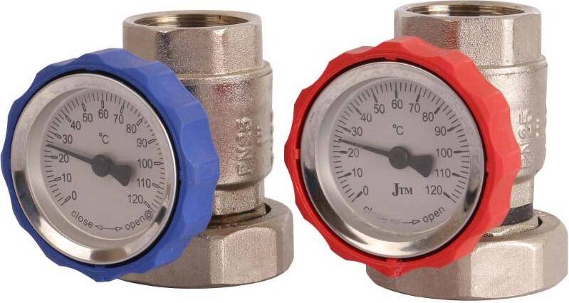 • Шаровые краны с термометром на обратной и подающей линиях (синий/красный) с накидной гайкой 1 1/2;