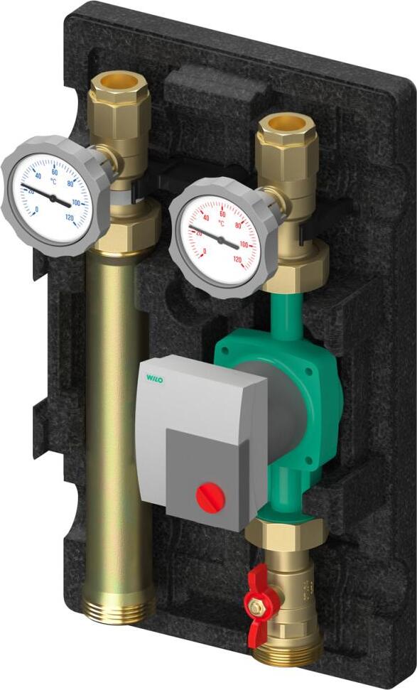 (с обратным клапаном в обратной линии); два контактных термометра встроенные в ручку шарового крана (диапазон 0 – 120 °C); один шаровой кран насоса с фланцем Meibes; EPP изоляция; нижние соединения 1 ½" M плоское уплотнение, верхние соединения с внутренней резьбой согласно размерам насоса; настенный кронштейн.