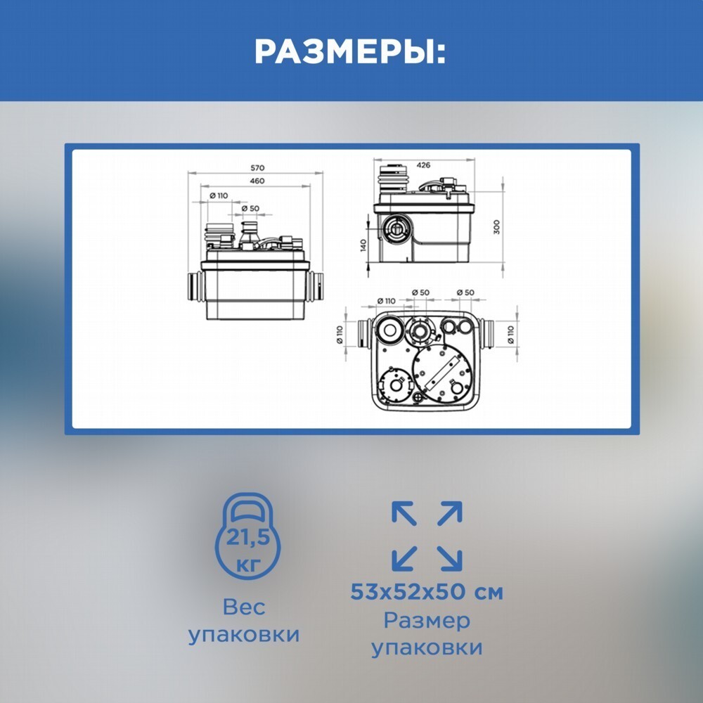 Современная и мощная насосная станция Sanicubic 1 подходит для оборудования дома или офиса всей необходимой сантехникой. Один прибор отлично справляется с высокой нагрузкой, позволяя подключить к принудительной канализации все необходимое оборудование. Мощность двигателя 1500 Вт. Подключить насос можно как к автономной канализации, так и к септику.