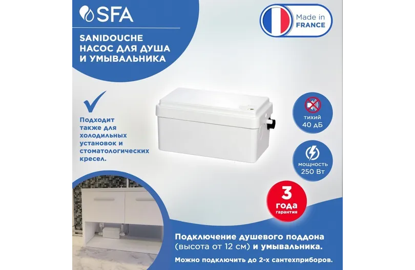 Компактный санитарный насос для душа SFA, надежный и практичный. Преимущества данной модели - установка для откачивания стоков из душевых кабин с поддоном от 12 см и подключение умывальника и биде. SANIDOUCHE прост в монтаже и использовании, экономичен и безопасен. Он позволит вам не отказывать себе в привычном комфорте даже тогда, когда возможности подключить душевую кабину к стационарной канализации не существует. Sanidouche — это европейское качество, продуманный дизайн и выгодная цена.