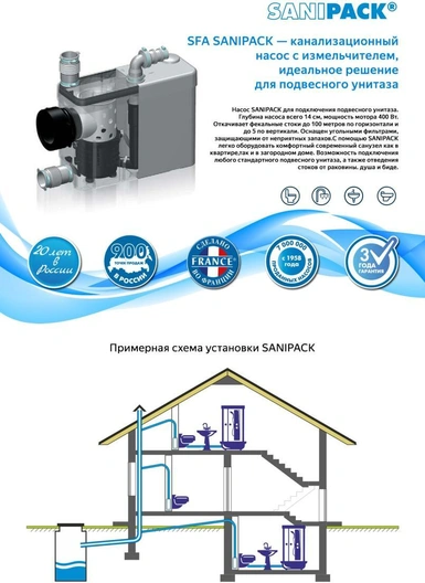 Канализационный насос для подключения подвесного унитаза. Насос SANIPACK для подключения подвесного унитаза. Он имеет следующие характеристики: