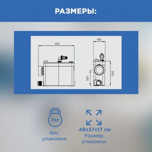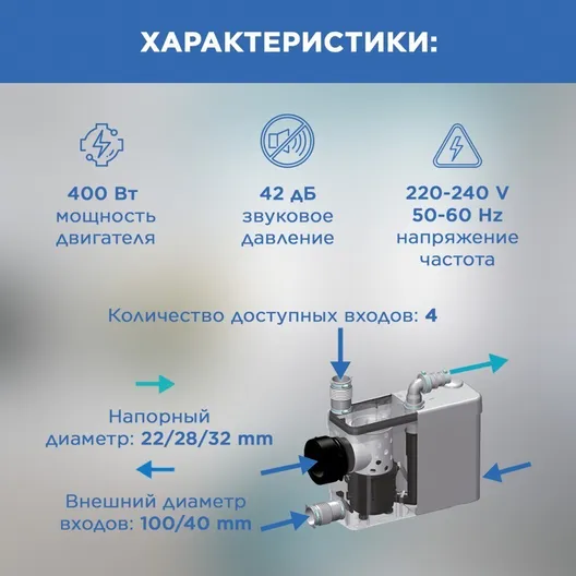 Откачивает фекальные стоки до 100 метров по горизонтали и до 5 метров по вертикали
