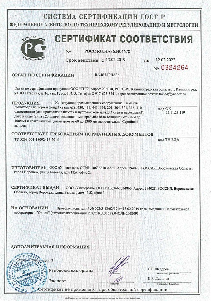 Дымоходная конструкция имеет стандартный набор различных элементов, при помощи которых существует возможность собрать дымоотводящий канал практически любой сложности. Все элементы стыкуются между собой по раструбной системе соединения. Они могут использоваться при монтаже дымоходов в кирпичных каналах уже вошедших в эксплуатацию жилых зданий, при монтаже каналов вентиляции. Одностенные дымоходы следует размещать только внутри отапливаемых помещений, при наружнем размещении дымоходы следует теплоизолировать.