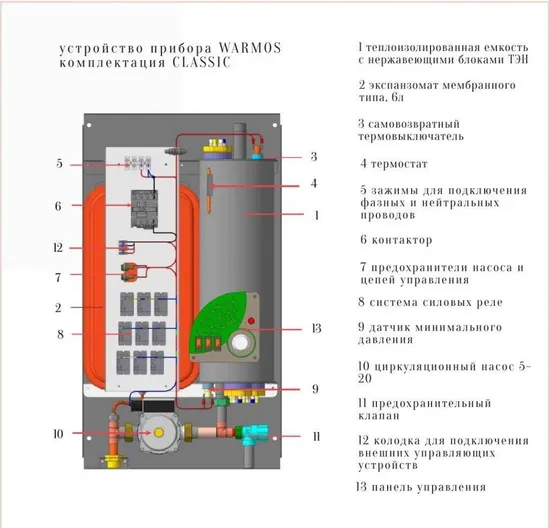 WARMOS – отопительный прибор, отличающийся высоким качеством сборки, оптимальными техническими характеристиками. В электрических котлах соединительные патрубки и контактные клеммы расположены на верхней и в нижней плоскостях котла, что позволяет устанавливать его в местах без доступа к боковым стенкам.