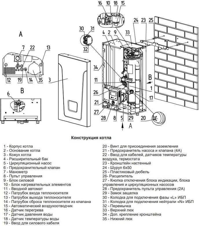 - Расширительный бак – 7,5 литров в моделях 6 кВт и 12 литров в моделях 9-36 кВт;