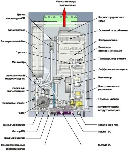 Были изменены присоединительные размеры камеры сгорания к дымоходу, и сейчас для подключения коаксиального комплекта диаметром 60/100 не требуется переходник с 75-го диаметра, а это значит что к нашим котлам теперь подходит универсальный дымоход и нет необходимости приобретать специальный коаксиал Navien.
