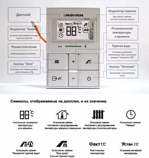 - самодиагностика, дистанционное управление отоплением, программы для горячего водоснабжения