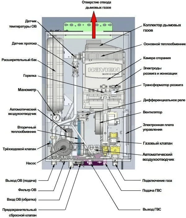 Были изменены присоединительные размеры камеры сгорания к дымоходу, и сейчас для подключения коаксиального комплекта диаметром 60/100 не требуется переходник с 75-го диаметра, а это значит что к нашим котлам теперь подходит универсальный дымоход и нет необходимости приобретать специальный коаксиал Navien.