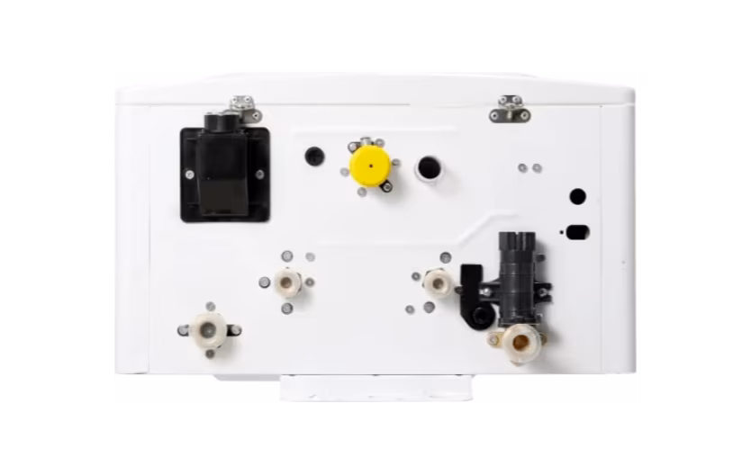 Котел оснащен отдельными выходами для подключения бойлера и универсальным подключением коаксиального дымохода 60/100 мм. Имеется возможность переключения на раздельный дымоход.