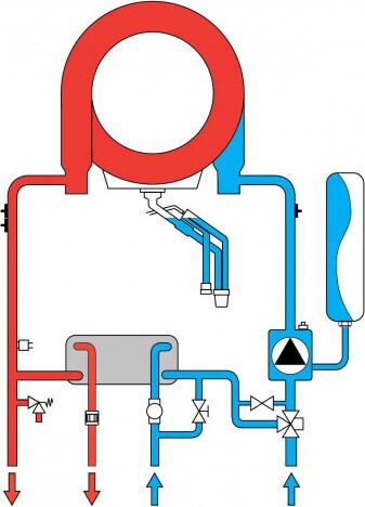 В одноконтурных моделях – встроенный трёхходовой кран с сервоприводом для возможности подключения опционного бойлера ГВС косвенного нагрева.