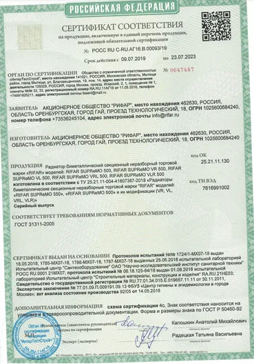 При установке радиатора в водяных системах отопления в качестве теплоносителя для модели RIFAR SUPReMO использовать только специально подготовленную воду согласно п. 4.8 СО 153-34.20.501-2003 «Правила технической эксплуатации электрических станций и сетей РФ».