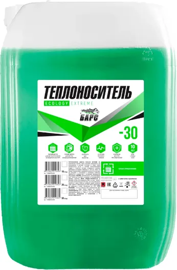 Теплоноситель «БАРС®» ECOLOGY EXTREME -30. Качественный носитель нового поколения предназначен для использования в системах отопления со всеми типами нагревательных котлов, в системах кондиционирования воздуха и вторичных контурах холодильных установок, работающих в интервале температур от -30°С до +108°С. Не образует канцерогенных соединений в процессе эксплуатации. Не агрессивен к пластиковым и каучуковым элементам. Применяется в соответствии с инструкцией производителя оборудования. Состав: пропиленгликоль, дистиллированная вода, импортный комплекс антипенных и антикоррозийных присадок, краситель. Срок хранения - 5 лет в закрытой таре производителя.