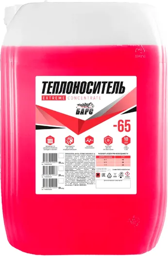 Теплоноситель «БАРС®» EXTREME CONCENTRATE -65. Качественный носитель нового поколения предназначен для использования в системах отопления со всеми типами нагревательных котлов, в системах кондиционирования воздуха и вторичных контурах холодильных установок, работающих в интервале температур от -65°С до +112°С. Не образует канцерогенных соединений в процессе эксплуатации. Не агрессивен к пластиковым и каучуковым элементам. Применяется в соответствии с инструкцией производителя оборудования. Состав: этиленгликоль высшего сорта, дистиллированная вода, импортный комплекс антипенных и антикоррозийных присадок, краситель. Срок хранения - 5 лет в закрытой таре производителя.