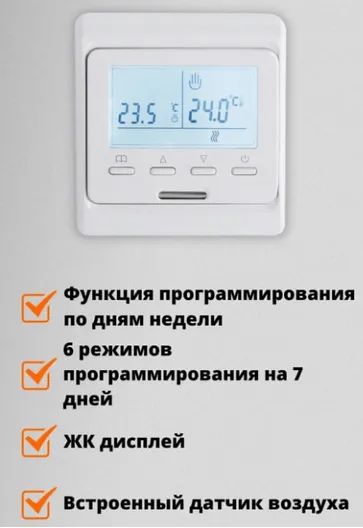 Терморегулятор оснащен функцией блокировки кнопок, что обеспечивает безопасность работы прибора. В терморегуляторе имеется независимый элемент питания для сохранения настроек. После отключения и включения электропитания терморегулятор автоматически включится в режим работы подогрев теплого пола, который был ранее задан пользователем. Встраивается в стандартную монтажную коробку.
