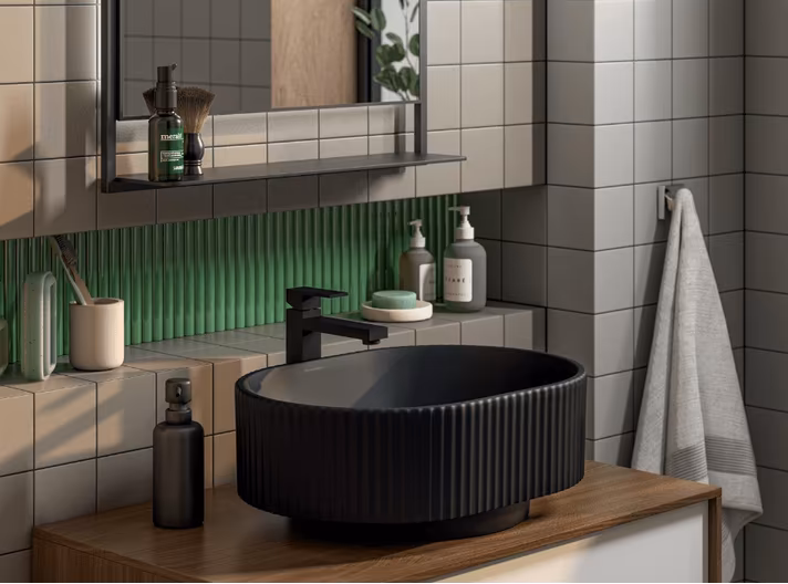 Помимо шестиугольной мозаики в серии предложена плитка 5х5 см, 10х10 см и восьмиугольники 24х24 см. С помощью этих форматов можно получить целый ряд интересных вариантов раскладки, на стене и на полу.