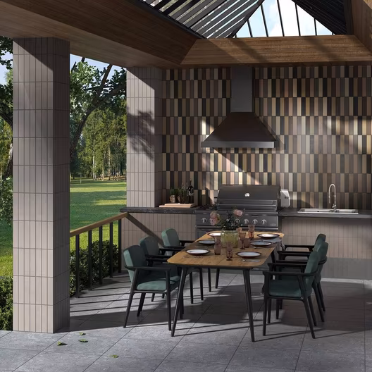 Фоновая плитка предлагает здесь актуальную гамму пастельных цветов с лёгкой структурой кирпича. Декоры дополняют основную палитру и содержат стильный геометрический рисунок: некоторые из его частей покрыты полупрозрачной гранилью. Необычная выкладка из декоративных элементов станет настоящим украшением интерьера.
