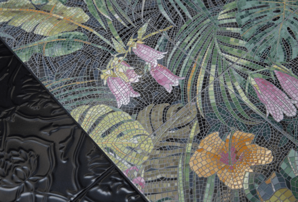В качестве компаньонов к флористическому панно предлагается строгая белая и черная матовая плитка. Если мы говорим о панно в ванной, то рядом с ним приживется санкерамика и мебель в современной стилистике, однотонные полотенца, светильники простых форм.