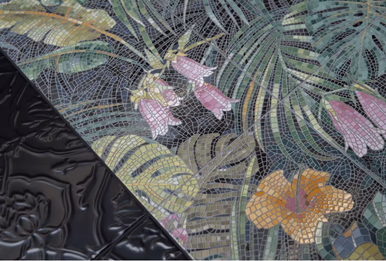 Плитка 20×50 см серии «Альвао» подразумевает бесшовную укладку, дополняющую реалистичность восприятия цветочного рисунка. Благодаря лёгкому глянцу керамической плитки под мозаику свет, особенно направленный, рождает эффект блестящей поверхности. Бордюр с цветочным рисунком, точь-в-точь как на панно из плитки, позволит создать нужные акценты: например, оформить зеркало, дополнительно выделить край ванны или мебели. Цветные бордюры и различные оттенки бордюра-бисера открывают новые горизонты в декорировании помещения.