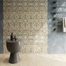 Цветочный орнаментальный декор керамического гранита составлен из тех же цветов мрамора, входящих в серию, и в сочетании со светло- и темно-бежевым керамическим гранитом формата 60×60 ковёр смотрится нежно, на фоне синего и зелёного — контрастно. Классические завитки с листьями, входящие в орнамент, нередко встречаются на лепном декоре, фарфоре, текстиле и достойно поддержат выбранную отделку. Орнамент в интерьере помогает создать правильные акценты. Классический пример — ковёр по центру комнаты или настенное панно. С помощью декора можно украсить дверной или оконный проем. Поскольку элементы орнамента, составленные воедино, образуют ритмичный узор, создающий притягательный декоративный акцент, использование уместно лишь на одной из поверхностей помещения.