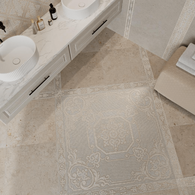 Для напольной укладки предлагается матовый керамический гранит серии Про Лаймстоун светлых оттенков с текстурой известняка.
