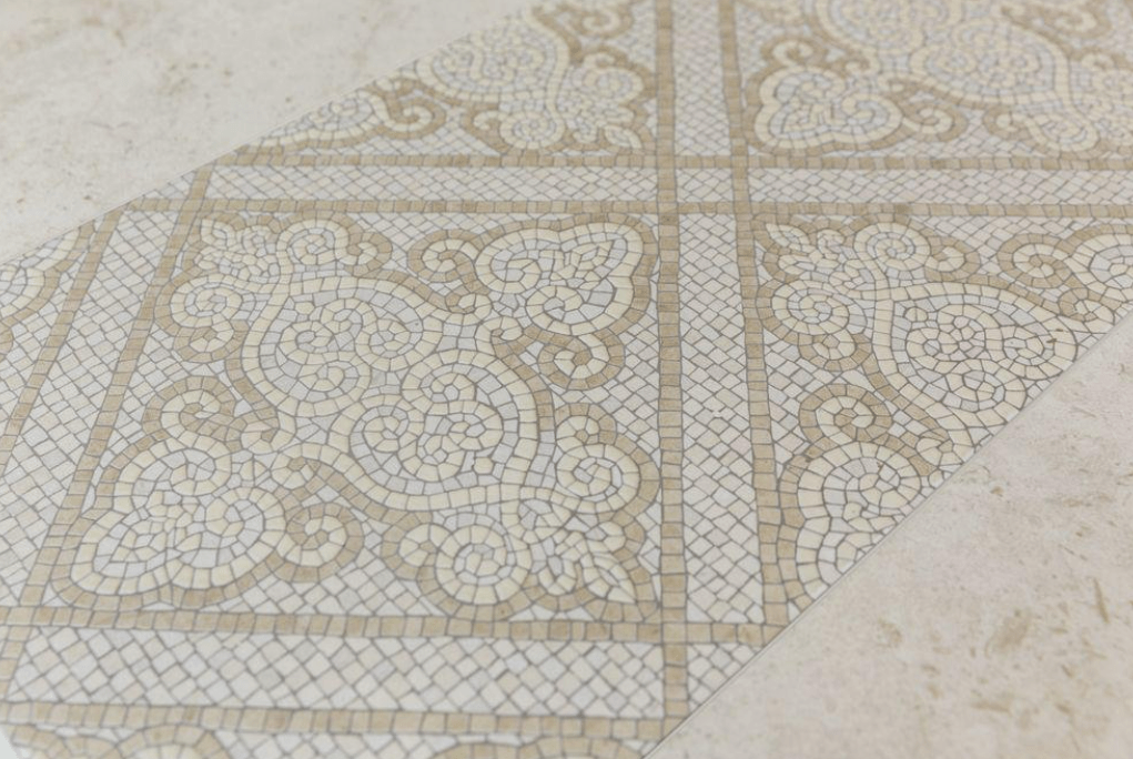 Керамический наборный декор для стен, созданный с использованием технологии гидроабразивной резки, предлагается дополнить вставками художественной мозаики — шестиугольной плиткой в традиционном португальском стиле.