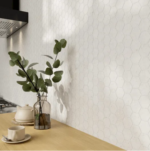 Керамический наборный декор для стен, созданный с использованием технологии гидроабразивной резки, предлагается дополнить вставками художественной мозаики — шестиугольной плиткой в традиционном португальском стиле.