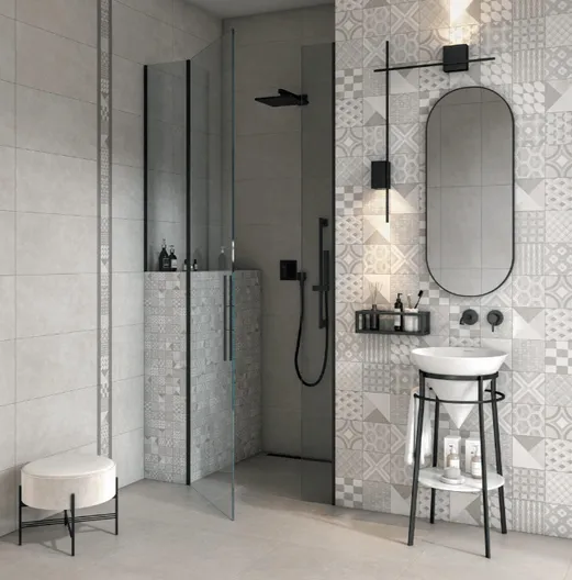 Фоновая настенная плитка 30×60 см деликатно воспроизводит бетонную поверхность, которая станет идеальной базой для большинства современных стилей. Плитка пэчворк напоминает фрагменты традиционной португальской мостовой «калсада португеза», узоры которой переосмыслены дизайнерами, и помимо этнических мотивов содержат простые геометрические и цветочные рисунки, делая лоскутную композицию из светлого и синего пэчворка универсальной. Волнообразный декор представлен в трёх фоновых цветах настенной плитки 30×60 см. Его слабовыраженная геометрическая структура приятна для восприятия. Рекомендуется для создания легких акцентов в отделке помещения. Для лестниц серия «Онда» предлагает в двух базовых оттенках серого ступени из керамогранита и подступенки, а также бордюры, вставки светлого и синего пэчворка.