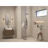 Керамическая плитка для стен воспроизводит светлый природный камень и представлена в формате 40×120. Она не только эффектно смотрится, но и помогает активно формировать пропорции пространства. Расположив плитку по вертикали, можно визуально «приподнять» потолок. Горизонтальная расклада позволяет зрительно раздвинуть стены.