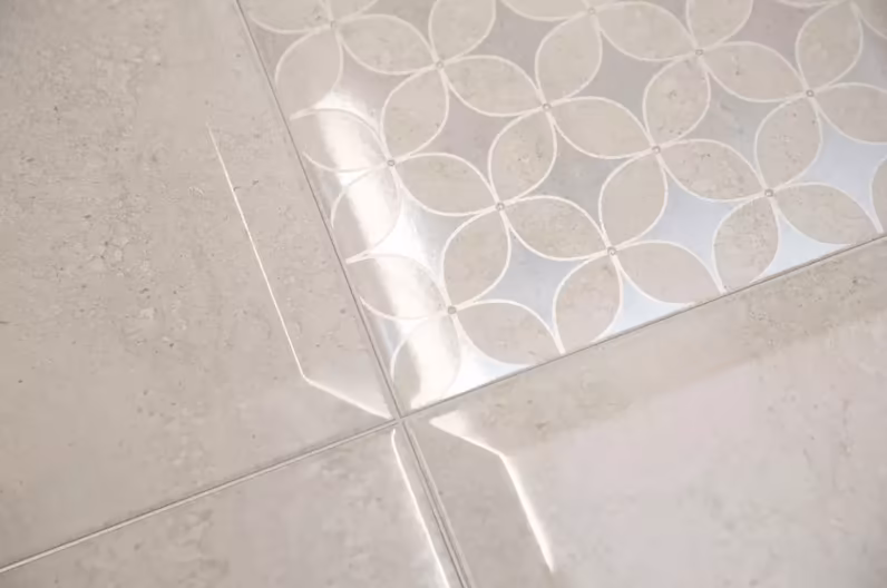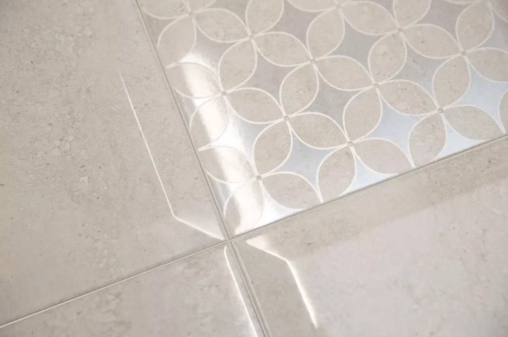Так как плитка 20×30 см с геометрическим узором из окружностей не содержит в рисунке углов, интерьер будет восприниматься нежным и уютным. Достаточно выложить узором одну из стен или использовать узорчатый керамический гранит 40×40 см в качестве каймы, повторяющей линии периметра пола, но не впритык к стенам, или шахматную укладку, и помещение заиграет искорками глянца. Фрагментарная отделка мозаичным декором внесет ощущение стабильности и порядка. Такая отделка лучше всего подойдёт для интерьеров в современных стилях. Отлично будет сочетаться с мебелью правильных форм, и не только глянцевой, как сама плитка 20×30 см. Если в обстановке присутствует много углов в сантехнике или мебели, выступы стен, декор с окружностями сбалансирует обстановку. А поскольку узор напоминает структуру кристаллической решётки, на его фоне или рядом будут выигрышно смотреться плафоны светильников с рёбрами и гранями, например, напоминающие алмазы. Однотонный текстиль или с похожим узором, с серебряной нитью, добавит гармонии в восприятие интерьера.