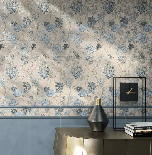 Притягательная красота серии «Жардим», в первую очередь, достойна интерьеров в неоклассическом стиле и шинуазри — оформлении с использованием декоративных приёмов древнего Китая. Если следовать традициям, декор из плитки с синими цветами будет уместен в верхней части стен. Нижнюю часть рекомендуем оформить классическими стеновыми панелями буазери, например, белого цвета из серии «Магнолия» такой же ширины 30 см. По цвету и формату также подойдёт базовая синяя плитка шириной 30 см из серии «Онда» или базовая бежевая плитка шириной 30 см из серии «Авенида».