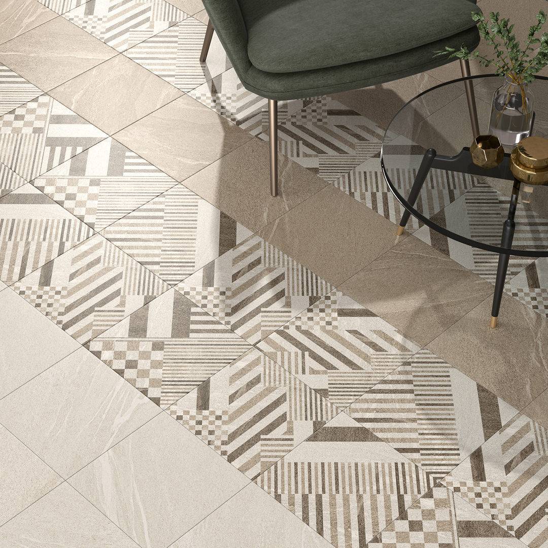 В этой серии керамического гранита передана необработанная поверхность камня «Неро Бореале». Выразительная структура дополнена естественной зернистой поверхностью и лёгкими прожилками, характерными для природного материала. Декоративные элементы с актуальным геометрическим орнаментом сочетают в себе разные оттенки и будут отлично смотреться с базовой плиткой любого цвета.