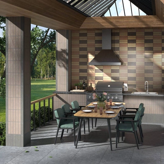 Фоновая плитка предлагает здесь актуальную гамму пастельных цветов с лёгкой структурой кирпича. Декоры дополняют основную палитру и содержат стильный геометрический рисунок: некоторые из его частей покрыты полупрозрачной гранилью. Необычная выкладка из декоративных элементов станет настоящим украшением интерьера.