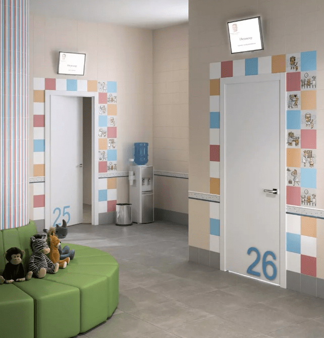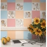 Шесть рисованных сюжетов отлично дополнят фоновую плитку в семейной клинике или детском медучреждении. Для придания изображениям дополнительного блеска и объёма использован прозрачный состав, создающий поверх рисунка толстый слой глазури.