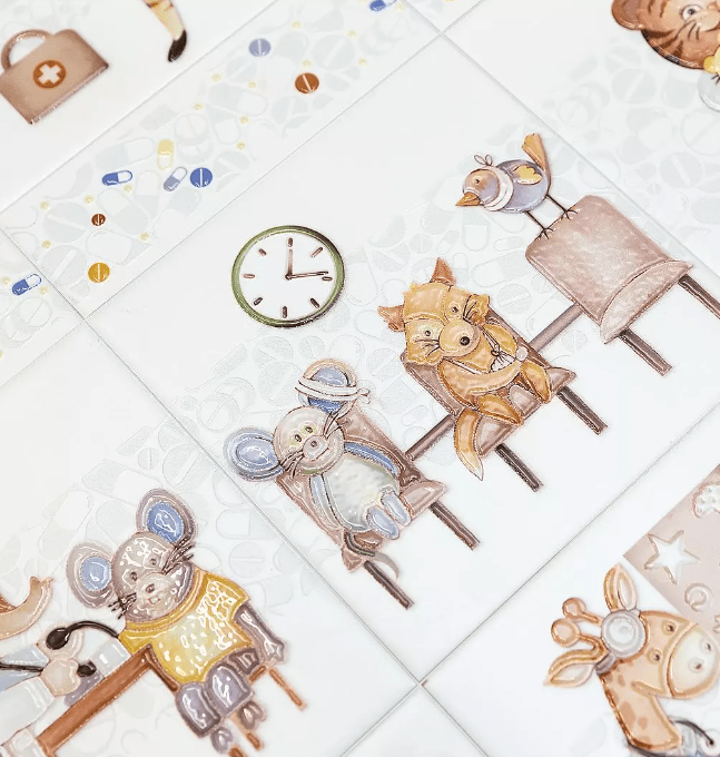 Шесть рисованных сюжетов отлично дополнят фоновую плитку в семейной клинике или детском медучреждении. Для придания изображениям дополнительного блеска и объёма использован прозрачный состав, создающий поверх рисунка толстый слой глазури.
