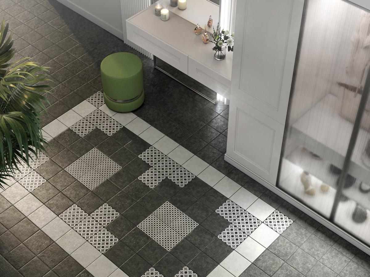 Сочетание черного и белого – безусловная классика, но в подобном исполнении и с такой графикой она выглядит очень современно. База и декоры выполнены в формате 20х20 см. Декоративные элементы решены методом цифровой печати: с её помощью точно воссоздан рисунок двухцветной мраморной инкрустации.