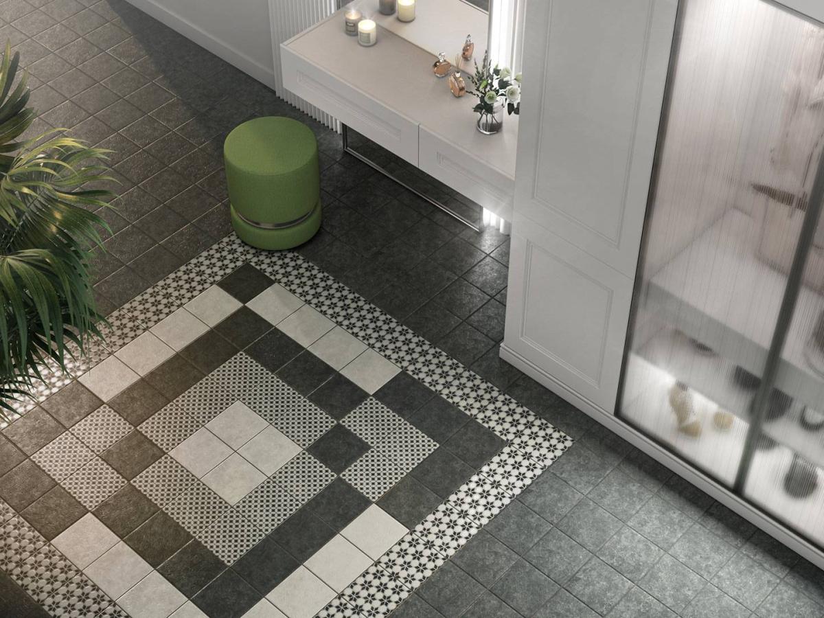 Сочетание черного и белого – безусловная классика, но в подобном исполнении и с такой графикой она выглядит очень современно. База и декоры выполнены в формате 20х20 см. Декоративные элементы решены методом цифровой печати: с её помощью точно воссоздан рисунок двухцветной мраморной инкрустации.