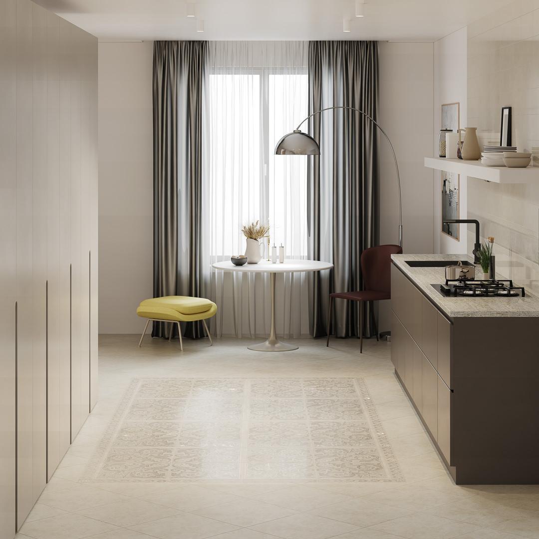 Лёгкая и нежная серия, наполненная теплом натурального камня, выполнена в двух цветах — светло-бежевом и светло-сером. Фоновую плитку дополняют настенные орнаменты, которые выглядят воздушно благодаря блестящим составам. Структурированные бордюры придадут керамической композиции строгость и завершённость.