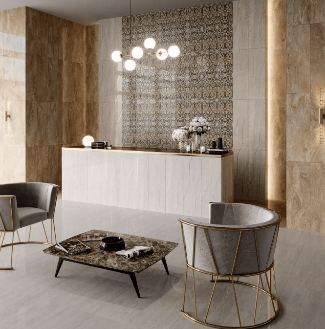 Глянцевая плитка и керамогранит под мрамор без декора будут уместны и в современных интерьерах, и в стиле европейского минимализма, в котором предпочтительно использование дорогих благородных материалов или их современных воспроизведений. В серии представлены декоративные элементы, в которых текстура мрамора дополнена геометрическим золотым орнаментом. Классический орнаментальный декор воспроизводит мраморную инкрустацию с глянцевой поверхностью, контуры-желобки заполнены эффектным блестящим составом.