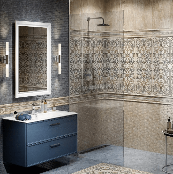 Цветочный орнаментальный декор керамического гранита составлен из тех же цветов мрамора, входящих в серию, и в сочетании со светло- и темно-бежевым керамическим гранитом формата 60×60 ковёр смотрится нежно, на фоне синего и зелёного — контрастно. Классические завитки с листьями, входящие в орнамент, нередко встречаются на лепном декоре, фарфоре, текстиле и достойно поддержат выбранную отделку. Орнамент в интерьере помогает создать правильные акценты. Классический пример — ковёр по центру комнаты или настенное панно. С помощью декора можно украсить дверной или оконный проем. Поскольку элементы орнамента, составленные воедино, образуют ритмичный узор, создающий притягательный декоративный акцент, использование уместно лишь на одной из поверхностей помещения.