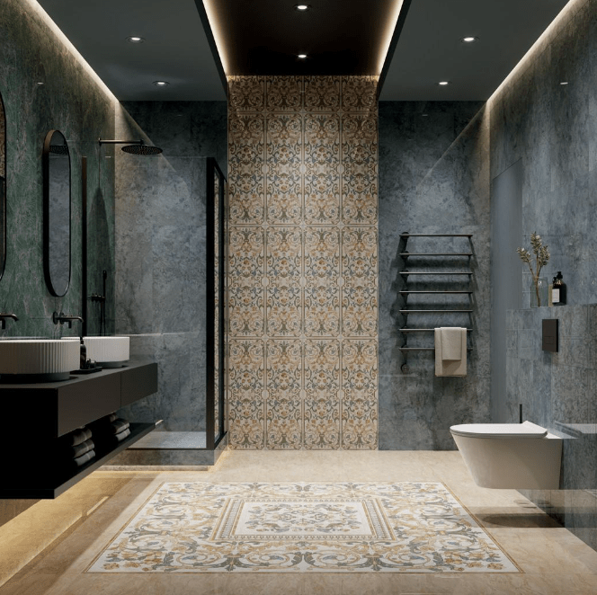 Цветочный орнаментальный декор керамического гранита составлен из тех же цветов мрамора, входящих в серию, и в сочетании со светло- и темно-бежевым керамическим гранитом формата 60×60 ковёр смотрится нежно, на фоне синего и зелёного — контрастно. Классические завитки с листьями, входящие в орнамент, нередко встречаются на лепном декоре, фарфоре, текстиле и достойно поддержат выбранную отделку. Орнамент в интерьере помогает создать правильные акценты. Классический пример — ковёр по центру комнаты или настенное панно. С помощью декора можно украсить дверной или оконный проем. Поскольку элементы орнамента, составленные воедино, образуют ритмичный узор, создающий притягательный декоративный акцент, использование уместно лишь на одной из поверхностей помещения.