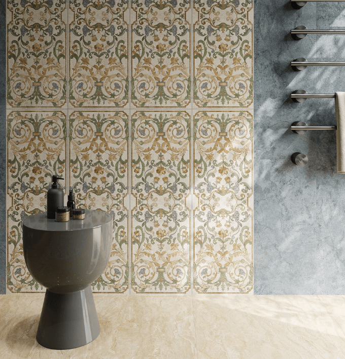 Цветочный орнаментальный декор керамического гранита составлен из тех же цветов мрамора, входящих в серию, и в сочетании со светло- и темно-бежевым керамическим гранитом формата 60×60 ковёр смотрится нежно, на фоне синего и зелёного — контрастно. Классические завитки с листьями, входящие в орнамент, нередко встречаются на лепном декоре, фарфоре, текстиле и достойно поддержат выбранную отделку. Орнамент в интерьере помогает создать правильные акценты. Классический пример — ковёр по центру комнаты или настенное панно. С помощью декора можно украсить дверной или оконный проем. Поскольку элементы орнамента, составленные воедино, образуют ритмичный узор, создающий притягательный декоративный акцент, использование уместно лишь на одной из поверхностей помещения.