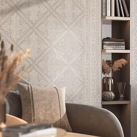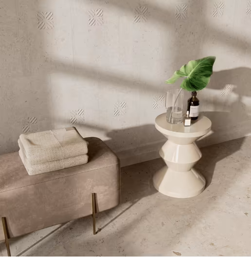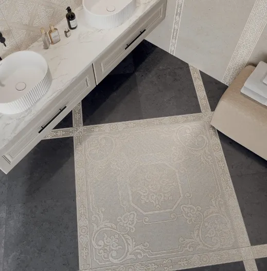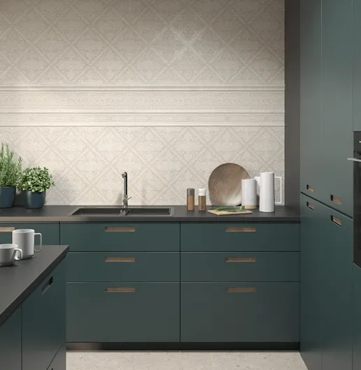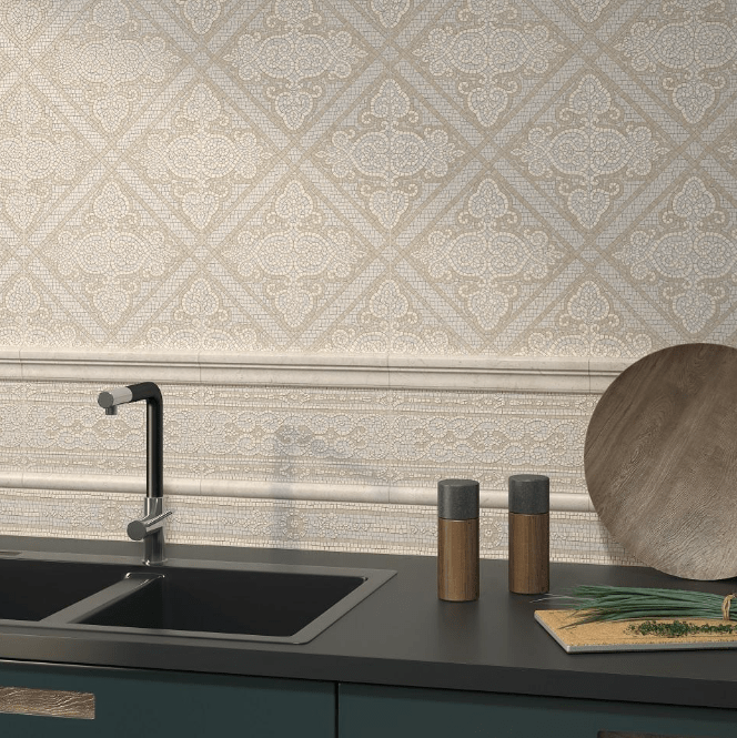 Наряду с фоновой плиткой необычайно легких природных оттенков для отделки стен предлагается плитка с потертым рельефным рисунком. Другой интересный этнический декор, используемый в плитке под мозаику, воспроизводит орнаменты традиционной португальской мостовой «калсада португеза». Узоры «плетёнкой», «волнами», классические цветочные орнаменты складывали из контрастных камней, известняка и гранита.