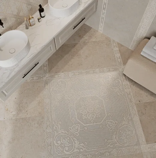Для напольной укладки предлагается матовый керамический гранит серии Про Лаймстоун светлых оттенков с текстурой известняка.