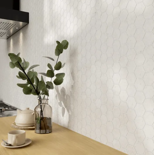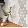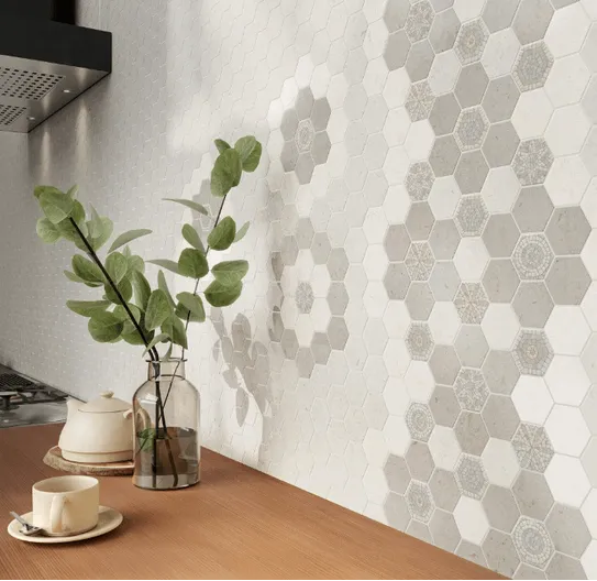 Керамический наборный декор для стен, созданный с использованием технологии гидроабразивной резки, предлагается дополнить вставками художественной мозаики — шестиугольной плиткой в традиционном португальском стиле.